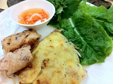 米粉を溶いた生地をフライパンでクレープ状に焼き、イカや豚、もやしなどをヌクマム(ナンプラー的なもの)で味付けをして、ヌクチャム(ヌクマムを使ったポン酢のようなもの)をつけて食べるんだけど。こちらも美味!