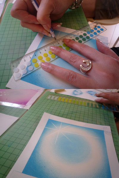 ベースのアートを書いた後は、消しゴムを使って思い思いの模様を描きます。