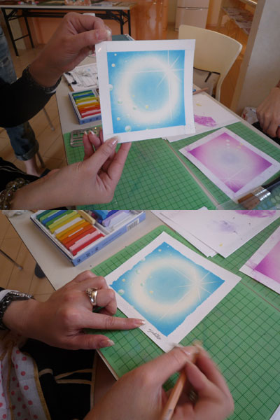 まずは、画用紙にパステルのベースの色を付け、先生が教えて下さるようにパステルを削り、