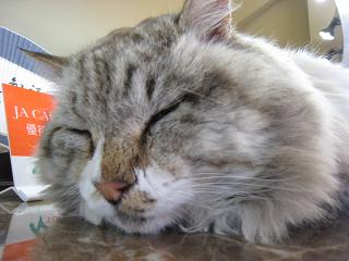 チェックアウトの朝^^ホテルのカウンターに猫ちゃんがどてーっと寝てるのを発見^^